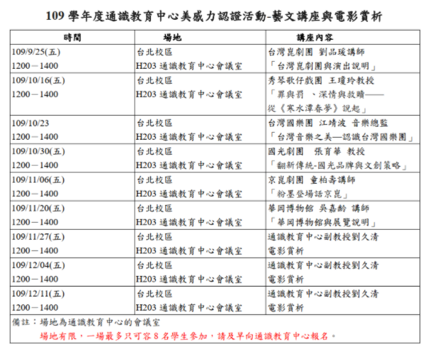 通識中心訂於109年9月25日~12月11日,每周五中午12:00-14:00於台北校區通識中心辦公室舉辦一系列藝文講座。